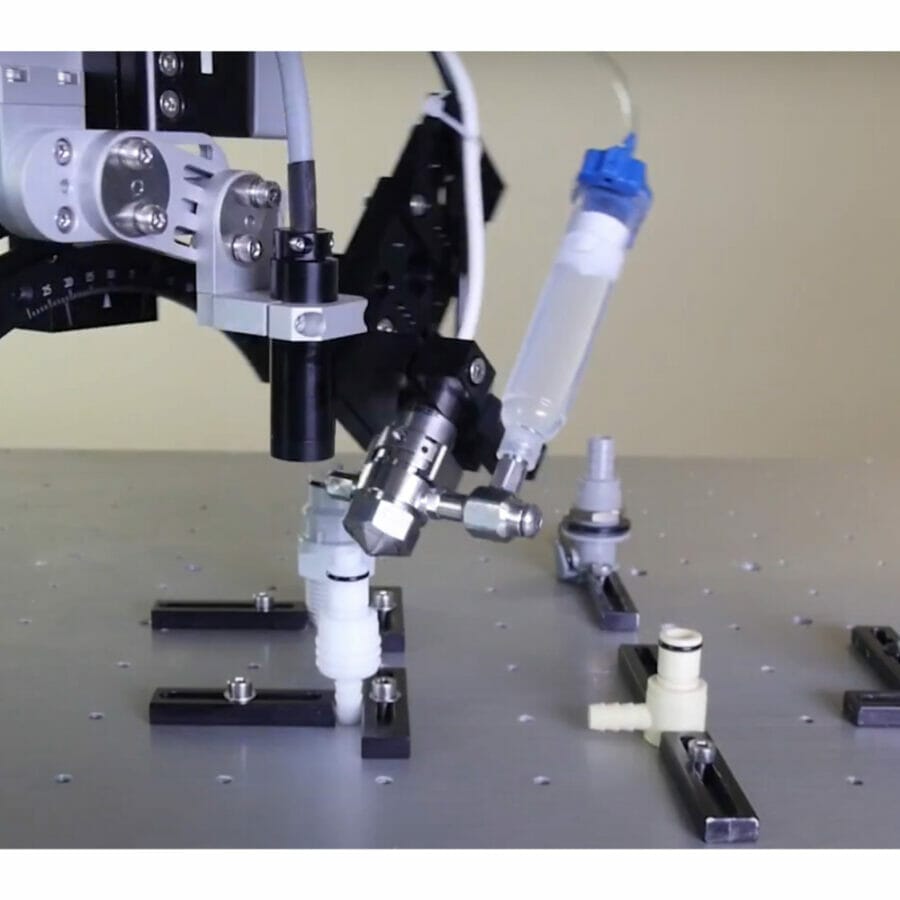 The GV Series industrial dispensing gantry robot can work as a standalone system or as a key part of an automated solution and is easily integrated into rotary tables and conveyor-fed assembly lines. Working envelopes range from 400 mm to 800 mm for precise fluid dispensing onto substrates requiring large work envelopes while not sacrificing repeatability.