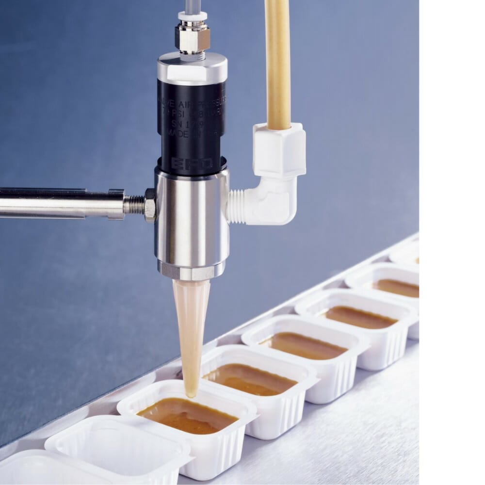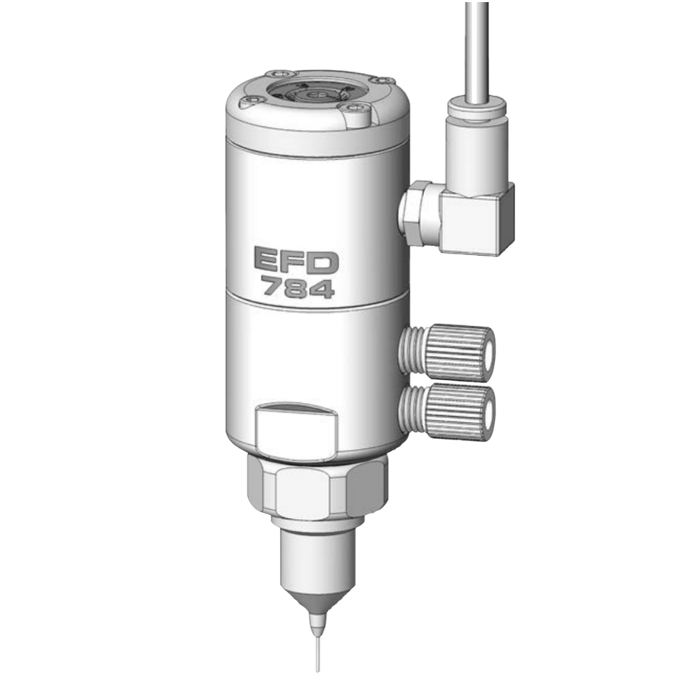 Another Valve series is the 784S-SS aseptic microspray valve, with FDA-compliant wetted parts, features a fluid flow path free of entrapment areas, ideal for sterile applications. Using Low Volume Low Pressure (LVLP) technology, the 784S-SS valve produces uniform spray patterns between 3.3 mm (0.13”) and 19.1 mm (0.75”) in diameter. It accurately controls the application of most low- to medium-viscosity fluids. For wider coverage, the 784S-SS-F model includes a fan air cap.